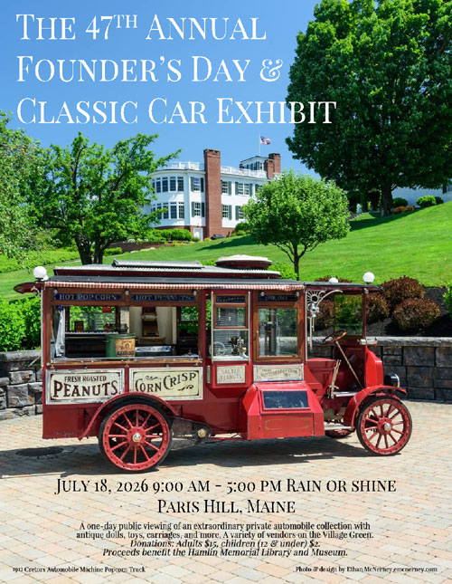 The day’s events also include a craft fair, live music and refreshments held on the Green in Paris Hill, where visitors are surrounded by some of Western Maines most beautiful mountain scenery and historic architecture. Admission to benefit Hamlin Memorial Library and Museum, Paris, ME. |