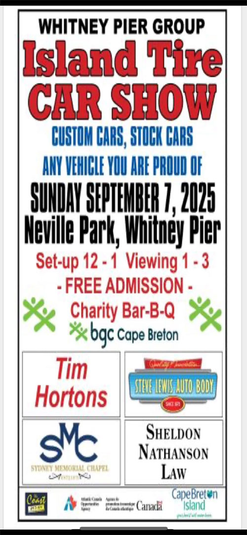 Free admission, Free concert, Charity BBQ in support of the Whitney Pier Youth Club. All are welcome! If you're proud of your ride, come on down and show it off!