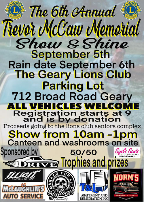(rain date 6th) All invited. This is a memorial car show show for my brother who passed in 2001 while working on his stock car ,we are raising money to donate in his honour to our community to help build a seniors complex, All vehicles are welcome come on out show us your rides and have fun. Everyone is welcome, canteen and washrooms on site, 50/50, trophies, and more.