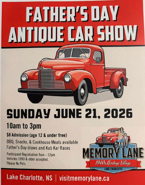 All registered antique vehicle drivers and one passenger receive free admission to the Heritage Village and complimentary coffee & tea.