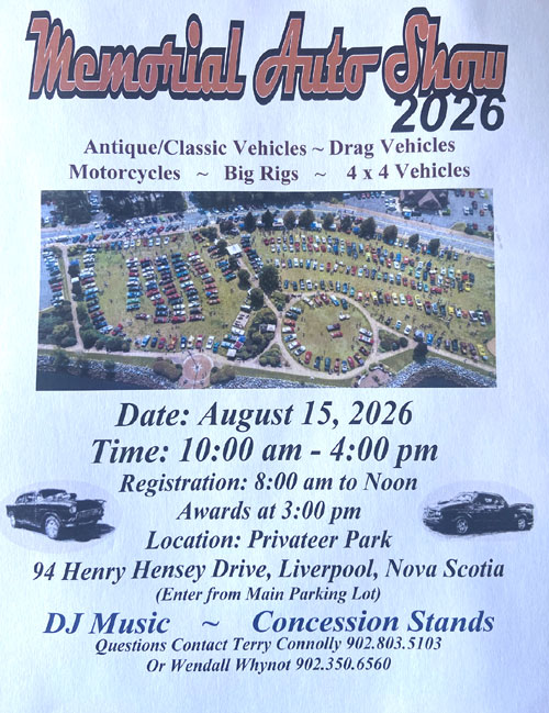 | | City : | Liverpool | | Province : | Nova Scotia | | Website : | | | Facebook: | | | Contact Name : | Terry Connolly or Wendall Whynot | | Phone : | 902-803-5103 902-350-6560 | | Fax : | | | E-mail : | tlc_78@hotmail.com | | Description : | Antiques / classic vehicles, Motorcycles, Drag vehicles, 4x4 Vehicles