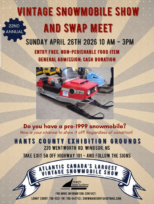 | | | | Event Name : | Hants Sno Dusters Vintage Snowmobile Show (April 26) |