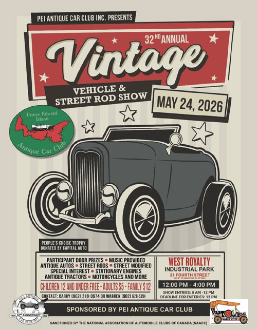 Door prizes for participants, People’s Choice donated by Capital Auto, music supplied and canteen setup. Proceeds to Community events . Sponsored by the PEI Antique Car Club.